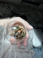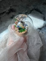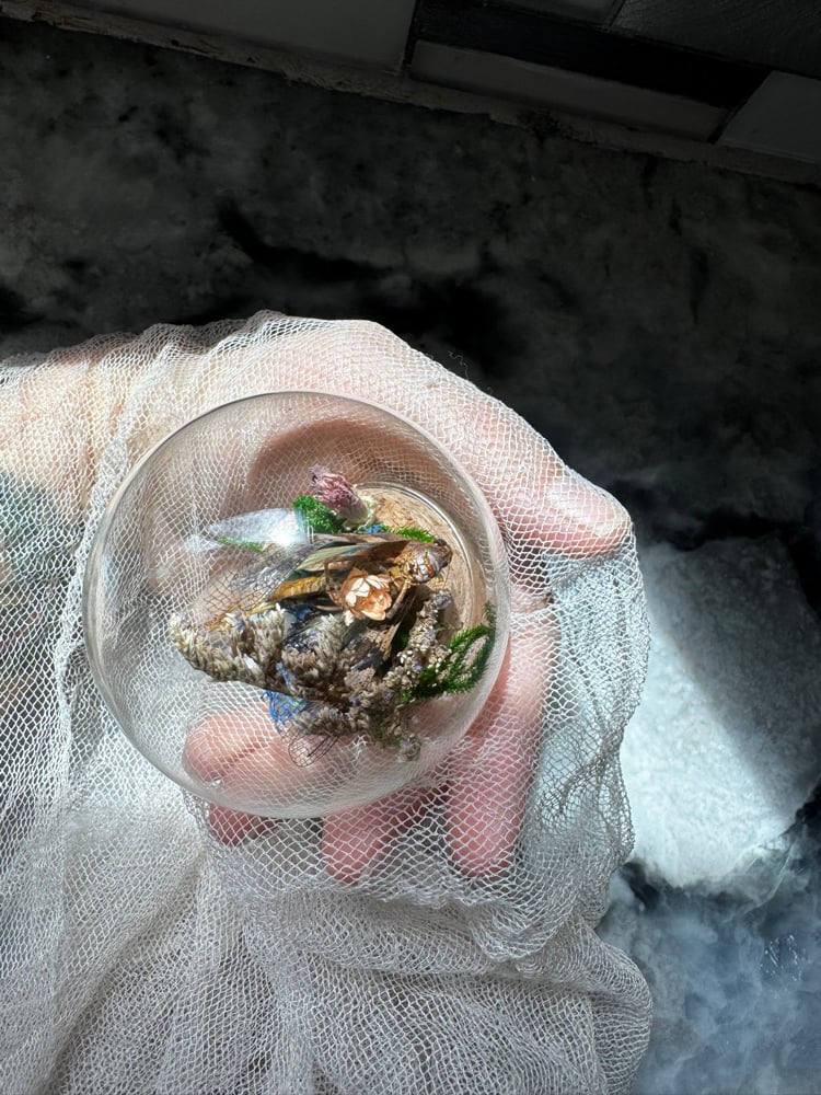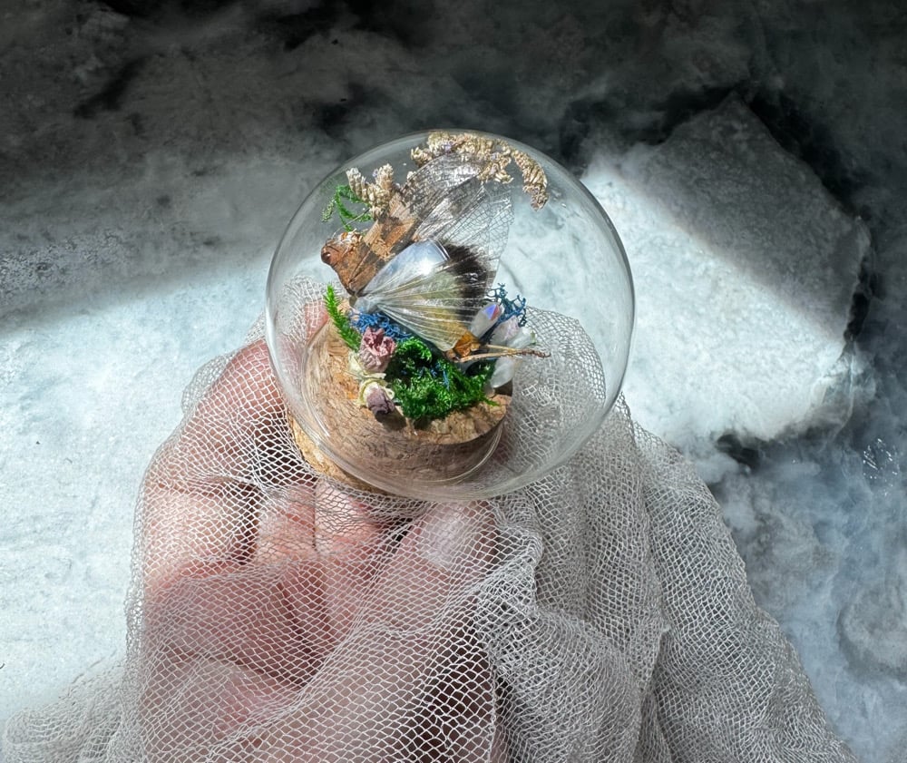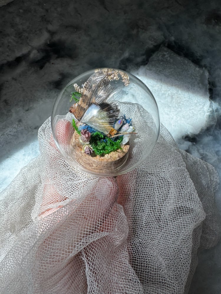 This gorgeous Arizona grasshopper passed away in my neighborhood just like this. I lovingly placed it in this glass coffin with a little flower between its hands, and embedded amongst moss and angel aura crystals. It’s such a pretty and unique piece.